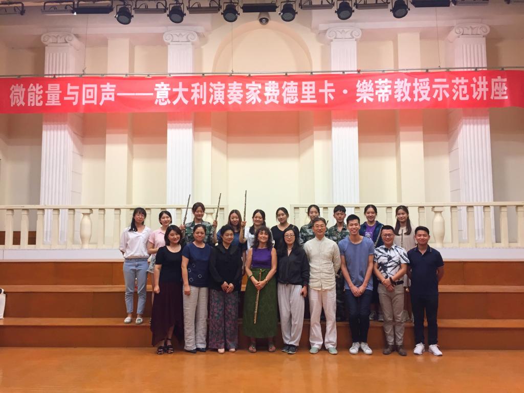 11日上午,费德里卡•乐蒂教授在音乐厅以“微能量与回声”为主题做学术讲座,描述了不同年代威尼斯作曲家和乐手之间的互动,威尼斯的传统风格、当代音乐和当代科技,及与新一代中国作曲风格的相互影响。期间乐蒂教授还与长笛专业的学生们探讨声音的感觉,并讲述了声感是怎样从古典音乐的固有形态下在科技进步的洪流中蜕变、探索其新的境界及新的语言。在互动环节,乐蒂教授就音乐会的有关内容及演奏法为大家进行了答疑解惑。