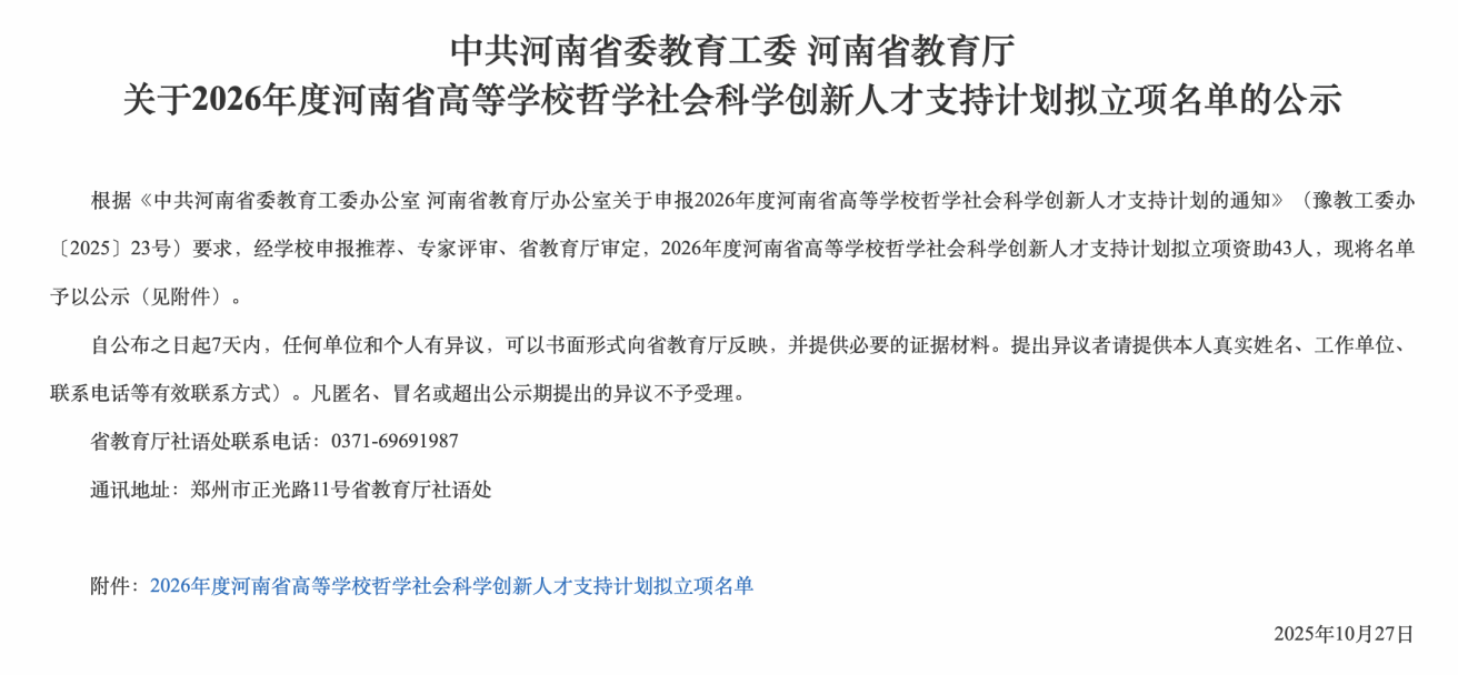 近日,河南省教育厅公布了“2026年度河南省高等学校哲学社会科学创新人才支持计划”拟立项名单,经个人申报、学校推荐、专家评审、省教育厅审定,本次计划拟立项资助43人,国产色情