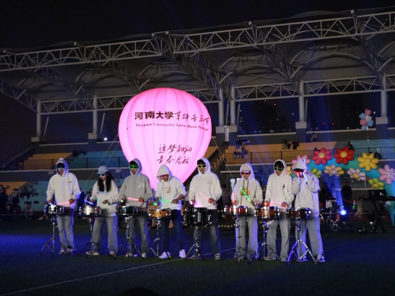 草坪音乐节,在郑州校区操场精彩上演。校党委书记季波、党委副书记杨萌芽以及相关职能部门、院系主要负责人与现场的2300余名学生共同观看了此次音乐节。