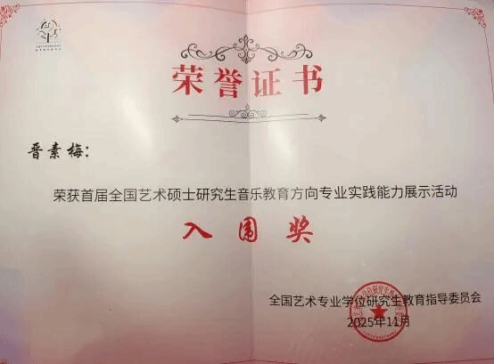 音乐教育人才培养的卓越成果。晋素梅(小学组)、杨菡(初中组)荣获“入围奖”,程瑞雪、袁凯荣获“入围奖指导教师”。此次优异成绩的取得,既源于师生团队历时数月的精心打磨,也得益于学院“以赛促教、以赛促研”培养机制的持续深化。