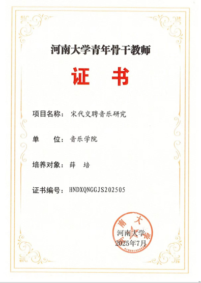 薛培副教授入选“2026年度河南省高等学校哲学社会科学创新人才支持计划”,其研究聚焦辽宋夏金礼乐互动交融。