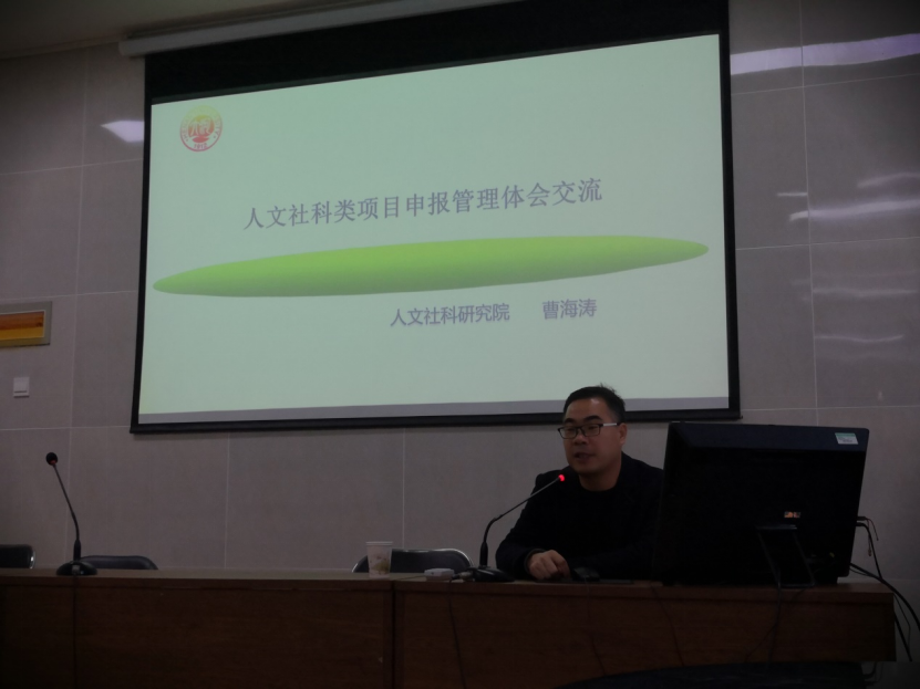 在学术报告厅举办科研辅导讲座。本期讲座由校人文社科研究院项目管理办公室曹海涛老师主讲,由副院长王新主持,学院七十余名专任教师当场聆听。