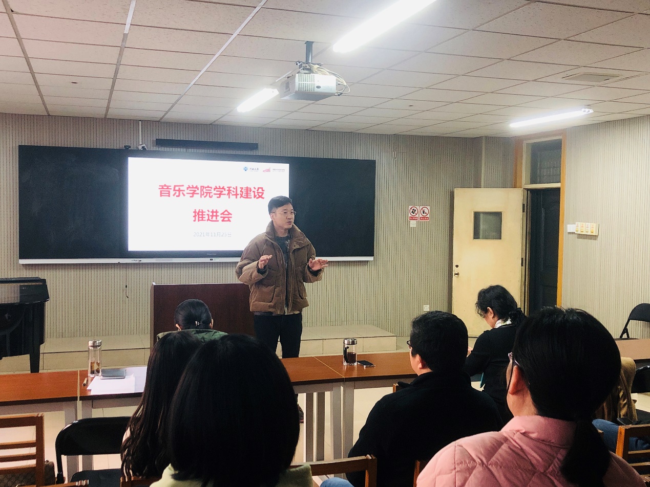 学科学位点的发展历程、“十三五”学科建设成就、“十四五”学科发展规划等方面,向与会者作了报告和说明。他在系统梳理“十三五”期间学院在科研与学科建设方面取得成绩的基础上,围绕学院科研与学科建设现状,通过对第五轮学科评估等学科评估指标体系的对照分析,就学院未来的科研与学科建设工作提出了意见建议,并就学院为鼓励教师开展科学研究、艺术创作、学术交流等活动采取的激励措施予以说明。