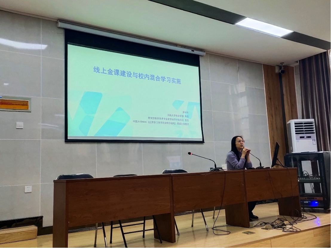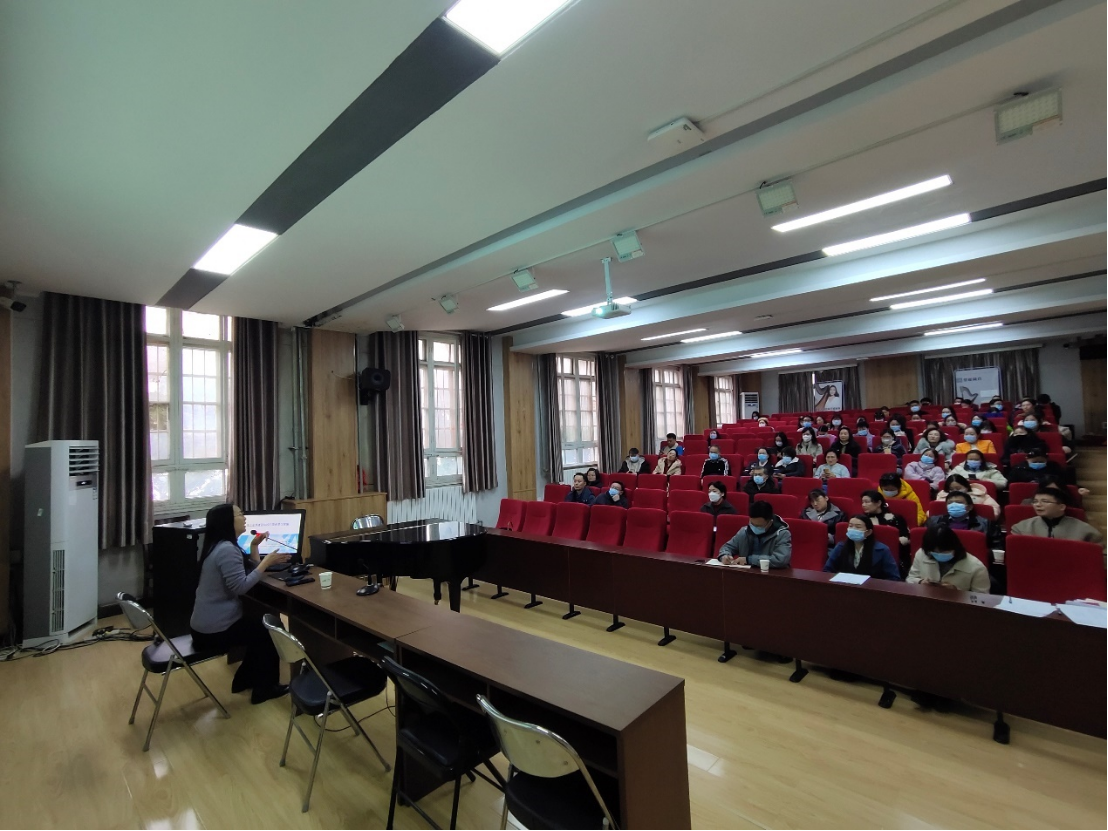 一流本科课程建设,提升本科教育教学质量,12月16日下午,学院邀请我校教育学部梁林梅教授在报告厅做题为“线上金课建设与校内混合学习实践”讲座。学院相关领导、各基层教学组织负责人及全体教师参加本次活动。讲座由公共艺术教研部主任王聚伍主持。