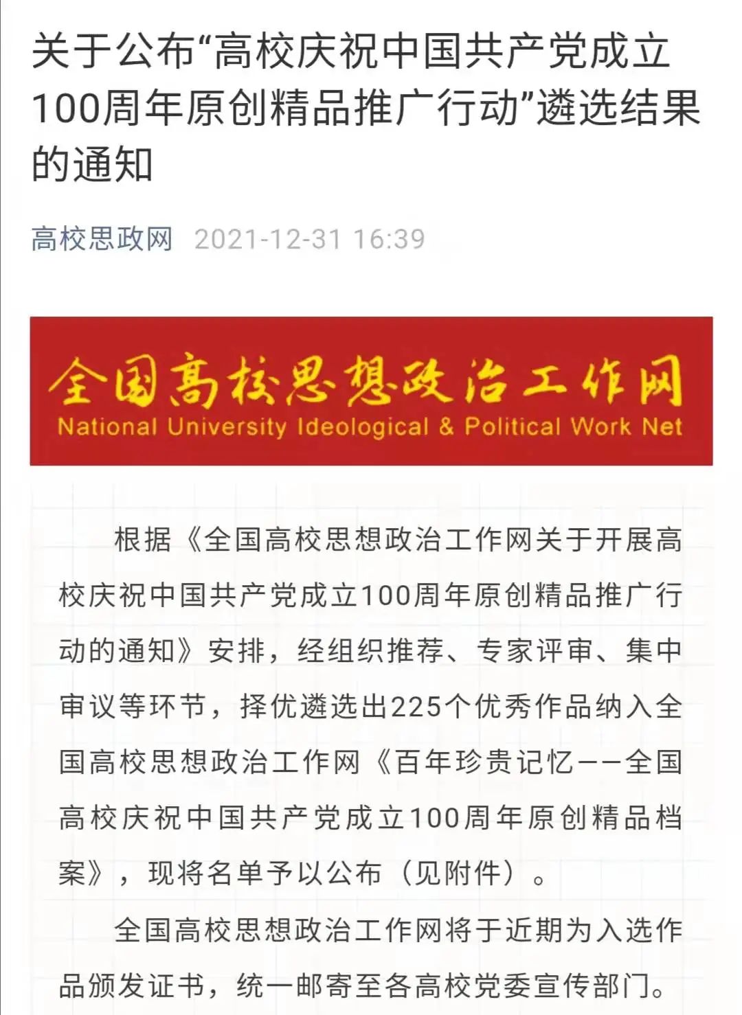 12月31日,教育部全国高校思想政治工作网发布《关于公布“高校庆祝中国共产党成立100周年原创精品推广行动”遴选结果的通知》,国产色情