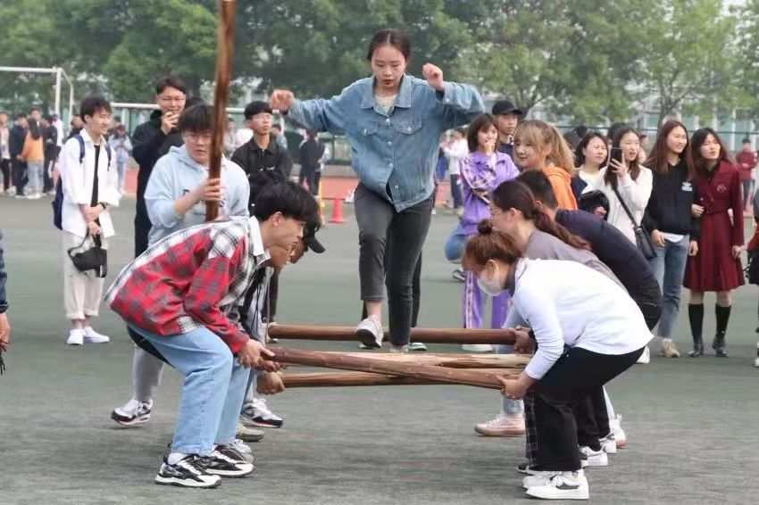 10、众星捧月:参赛人数8人。8人手持4支横杆以相互接触交叉的方式成“井”字状,将1篮球放于(不允许用横杆夹)中心位置。发令后8个人双手各握横杆端部,在不使篮球掉落的情况下,以8字形前进绕过3个障碍杆后以同样方式返回。