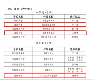 河南省大学生校园歌手大赛,作品《雪白的鸽子》《苍天把眼睁一睁》荣获民族(专业类)一等奖,《狠似高山仇似海》荣获民族(专业类)二等奖;《橘子》荣获通俗类一等奖;《我爱这土地》《漫步街上》荣获美声(专业组)一等奖,《鸟儿在风中歌唱》荣获美声(专业组)二等奖;《为自己鼓掌》荣获原创类一等奖,《母亲的光辉》荣获原创类二等奖。