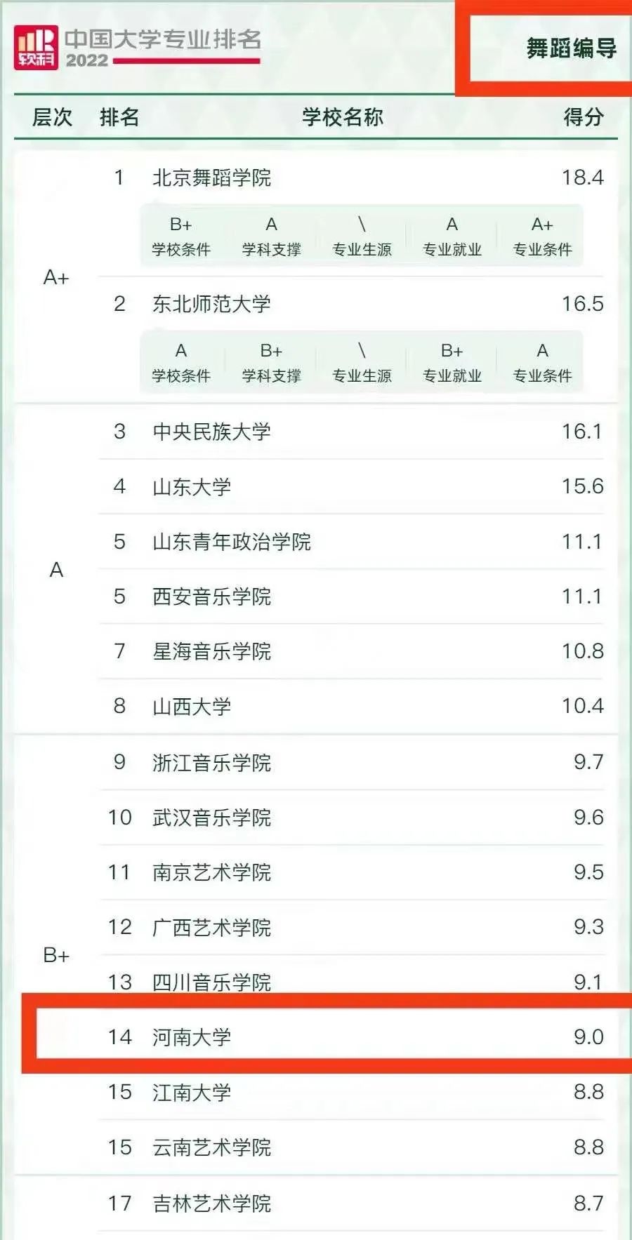 舞蹈编导专业,全国43所参评院校,我校位列第14名,B+等级。
