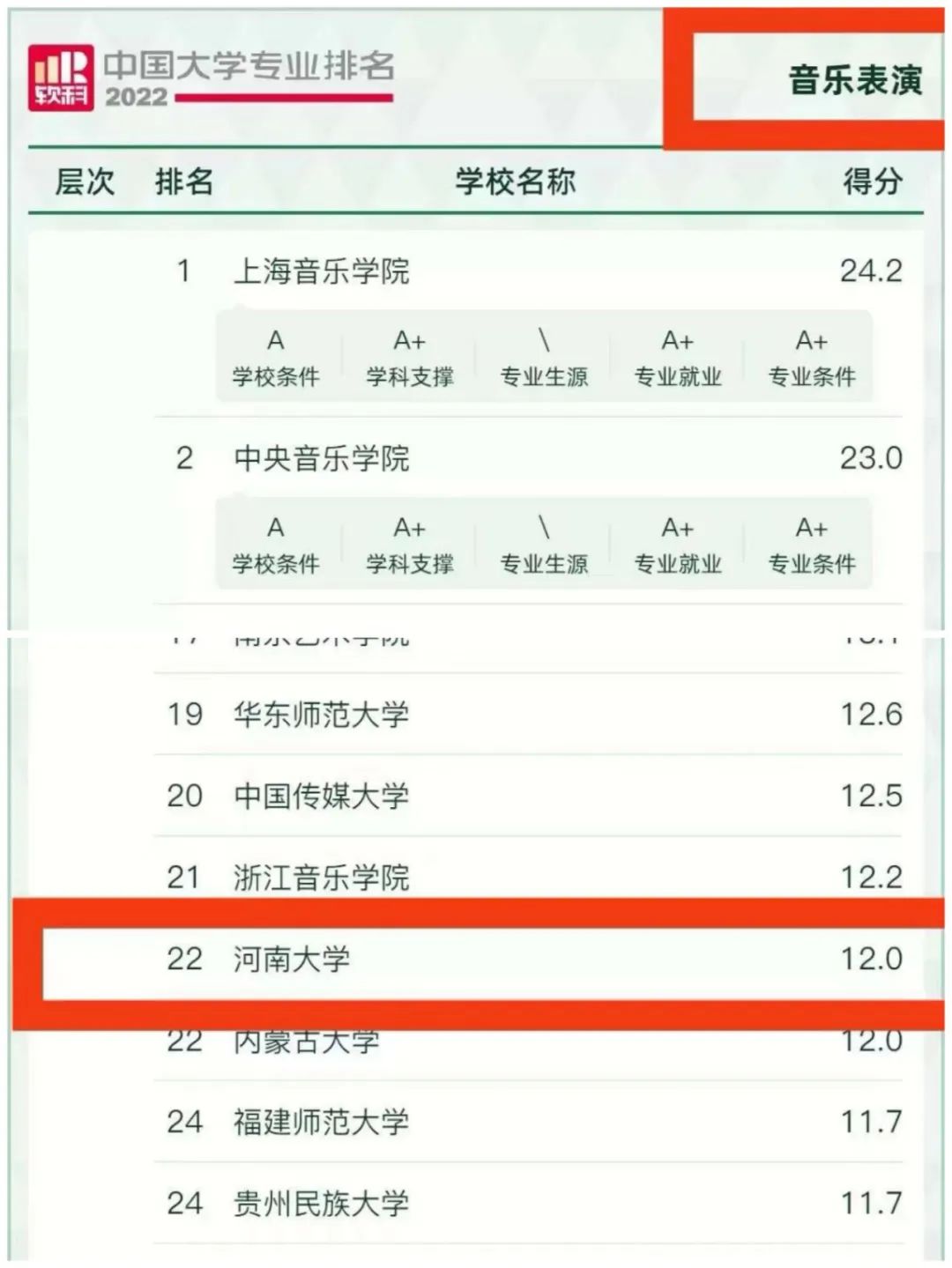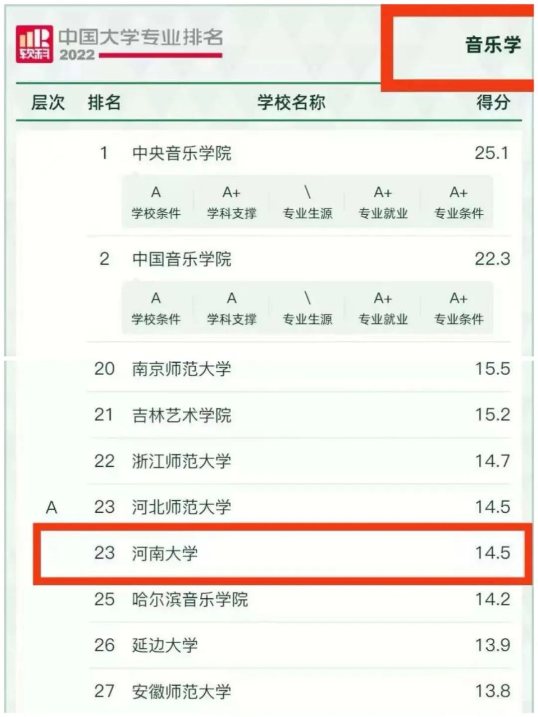 音乐学专业,全国228所参评院校,我校位列第23名,A等级。