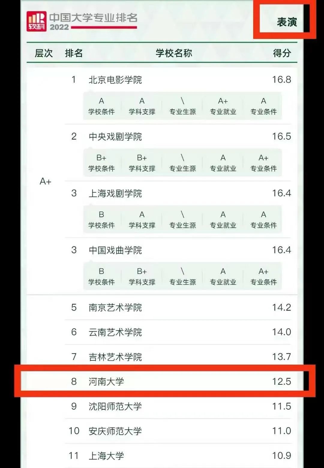 表演专业,全国98所参评院校,我校位列第8名,A等级。
