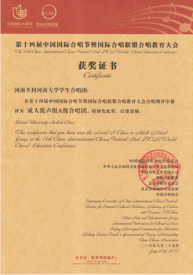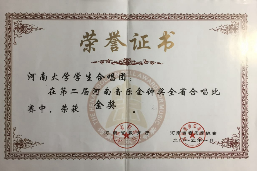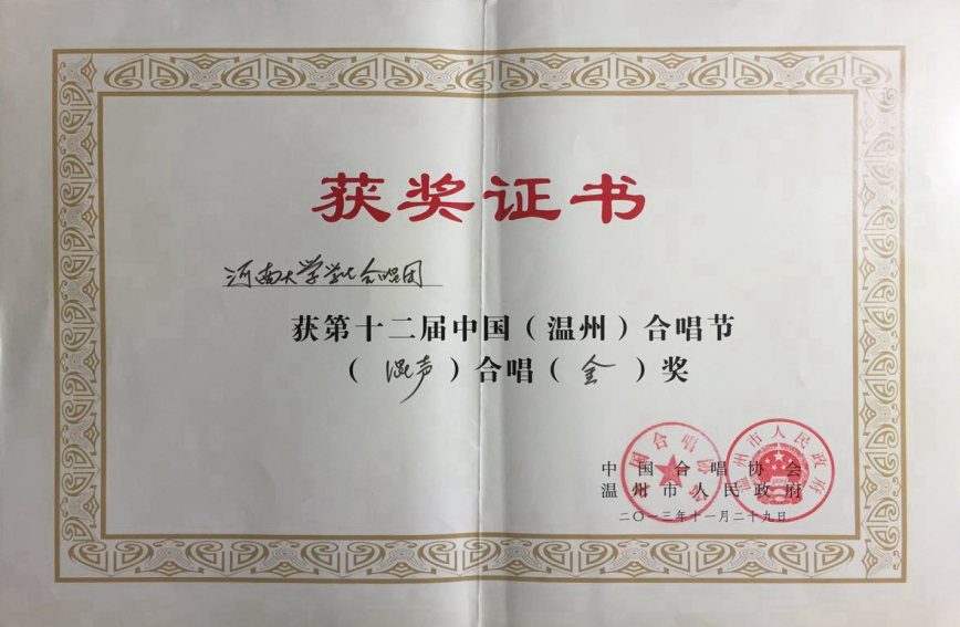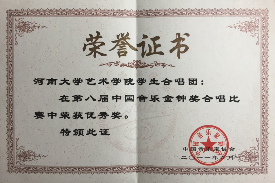 副院长韩梅教授任团长,袁凯副教授任指挥,是一支文化修养深厚的优秀学生社团,在世界合唱比赛(World Choir Games)、中国音乐金钟奖合唱比赛、教育部大学生艺术展演、中国合唱节、中国国际合唱节、中国嘉陵江合唱节、中国黄龙洞国际合唱艺术周、中国黄河合唱周、河南省音乐金钟奖合唱比赛、河南省合唱节等国内外合唱重要赛事中屡获殊荣。