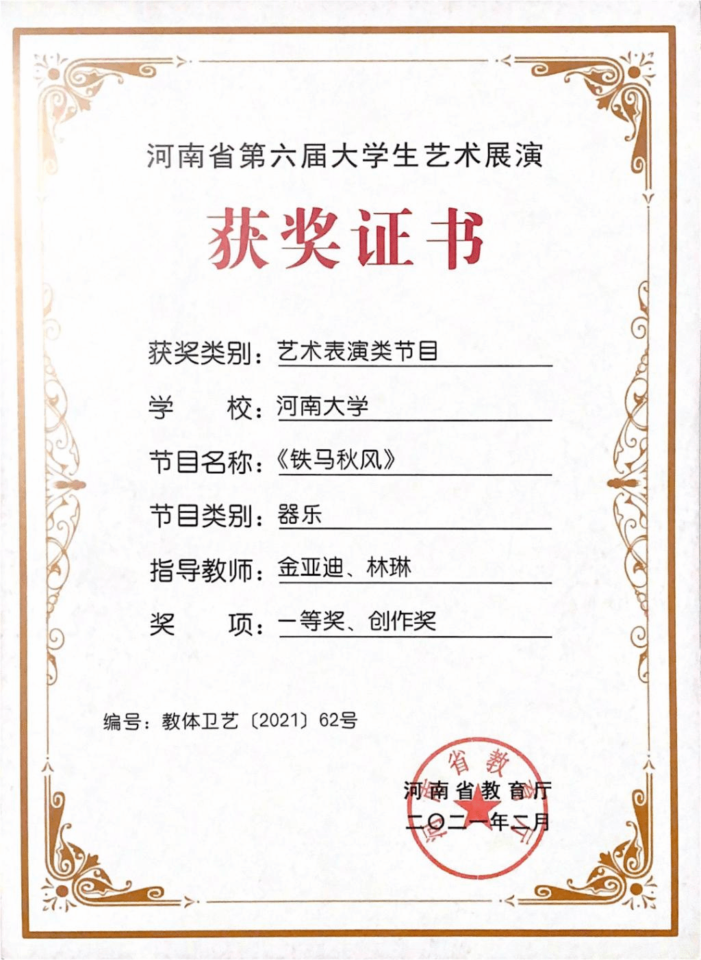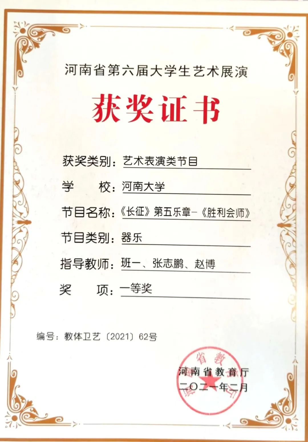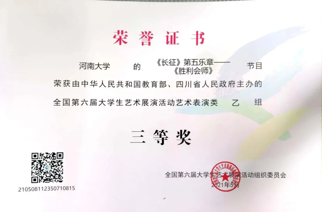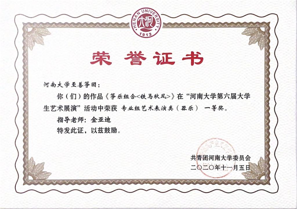 至善交响乐团荣获“全国第六届大学生艺术展演河南赛区一等奖”,并参加了河南省教育厅在周口师范学院举办的河南省第六届大学生艺术展演器乐专场现场展演。2021年5月获“全国第六届大学生艺术展演专业组三等奖”。