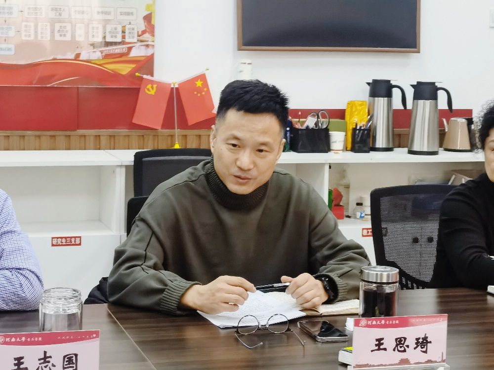 针对于学院发展,谭贞从三个方面提出指导性的意见和建议,一是要加强统筹谋划,在重点求突破方面有所作为,要按照学校制定的体制机制改革方案要求,围绕学科建设、专业建设、人才培养等方面研究制定科学有效的建设方案,切实推动学院高质量发展;二是要充分发挥学院特色优势,狠抓落实,持续做好人才引育,一流课程、师资队伍建设,科研教学和社会服务,切实增强学院核心竞争力;三是要进一步务实创新,围绕中心、服务大局,结合实际突出特点、打造亮点,提升工作成效。