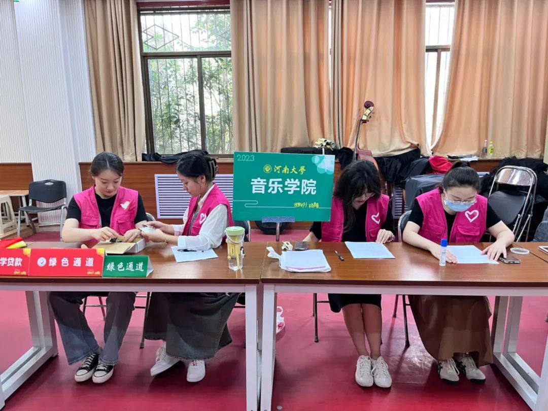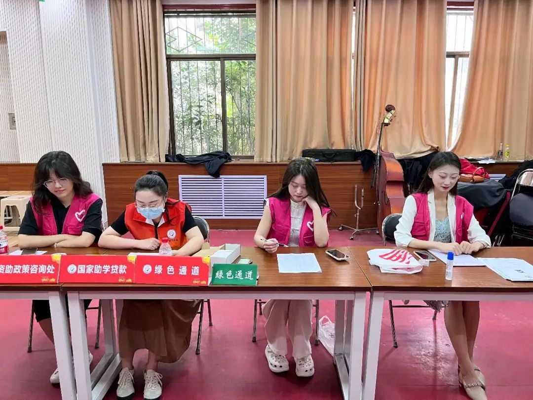 器乐教研室,并为申请了国家助学贷款等资助项目的同学单独开放“绿色通道”咨询办理窗口,经过不断完善,多方协调,为前来报到的新生争取到最大限度的便利。同时学院的学生干部在张志鹏老师与于亚龙老师的领导下,提前分配好各自的任务,确保每个迎新环节都有工作人员指引、接待。