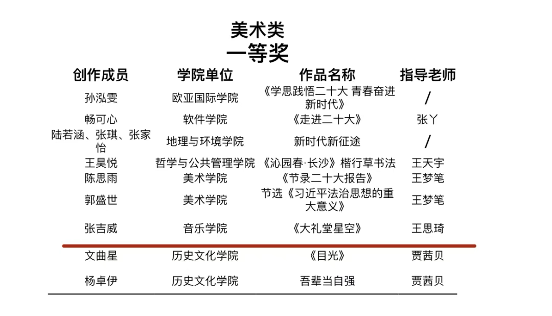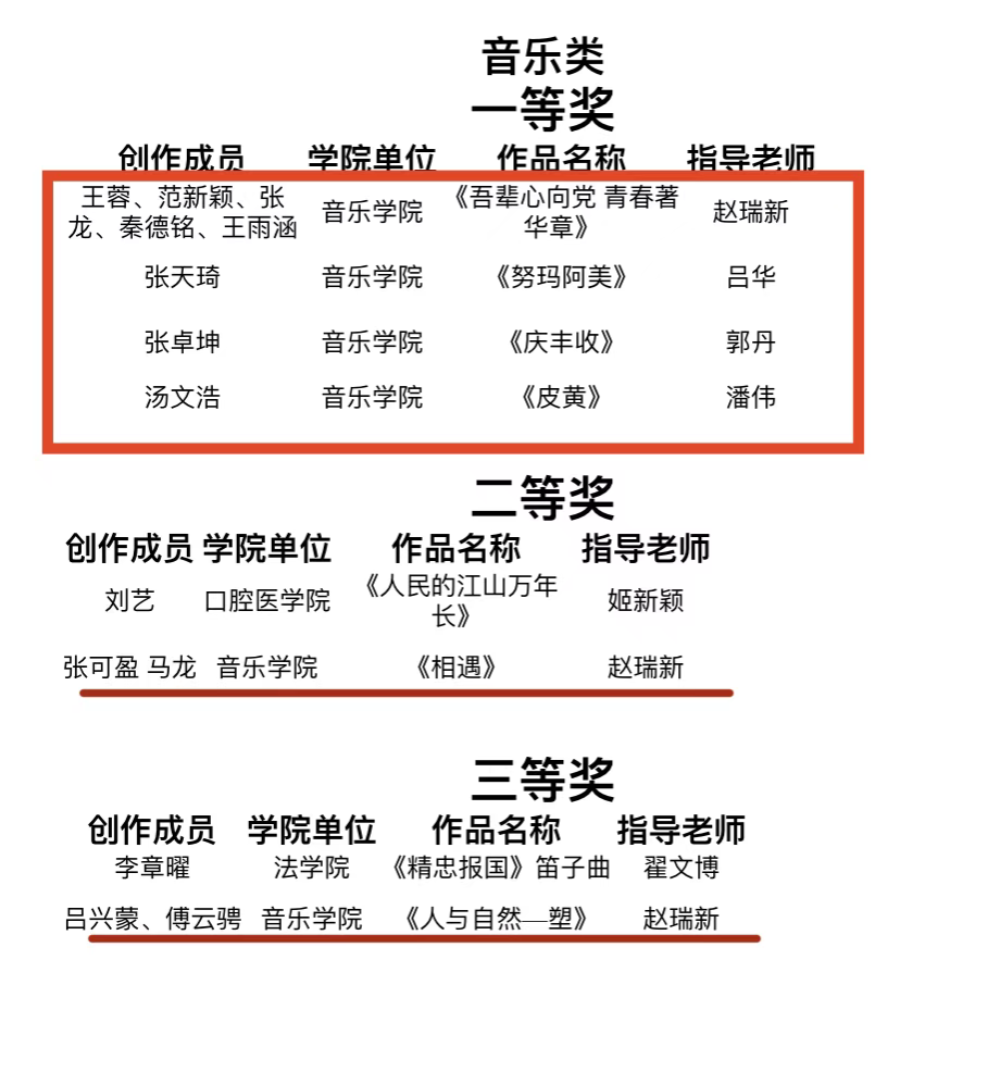 《吾辈心向党 青春著华章》《努马阿美》《庆丰收》《皮黄》四个音乐类作品荣获一等奖;《相遇》获得音乐类二等奖;《人与自然—塑》获得音乐类三等奖!赵瑞新老师荣获“优秀指导教师”称号。
