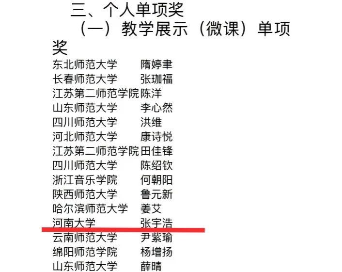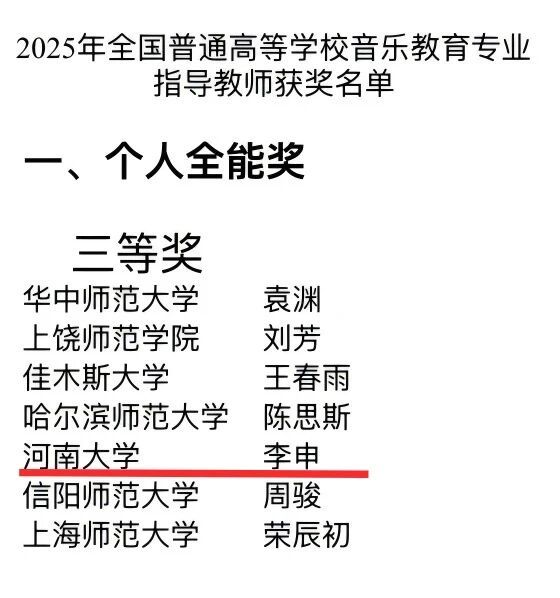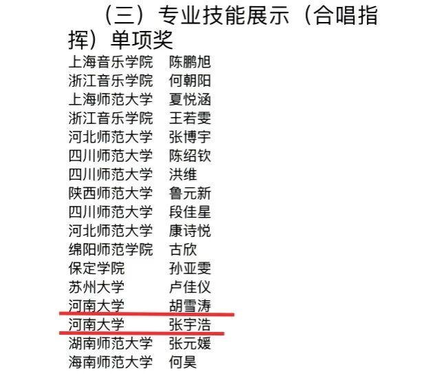 教师李申,学生张宇浩、胡雪涛、屈威含代表学校参赛。李申荣获教师个人全能奖三等奖;张宇浩荣获个人全能一等奖、微课展示单项奖、合唱指挥单项奖、器乐展示单项奖;胡雪涛荣获合唱指挥单项奖、戏曲展示单项奖;屈威含荣获个人全能二等奖。同时,学生代表队荣获团体二等奖,充分展示了我校音乐教育专业的雄厚实力。