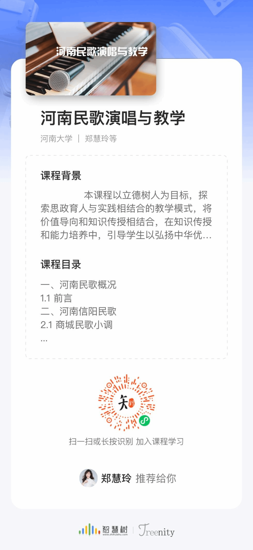 又一门慕课课程《河南民歌演唱与教学》在智慧树平台上线。目前,共有五门相关课程在中国慕课网和智慧树平台上线。学院致力于教学创新改革与信息技术的结合,推动教学模式从教师中心向学生中心转变,将教学活动延伸到课堂内外。加强单一性评价到多元评价体系构建,注重传统文化和地域文化特色课程建设,不断优化课程体系,全面提升课程教学质量。