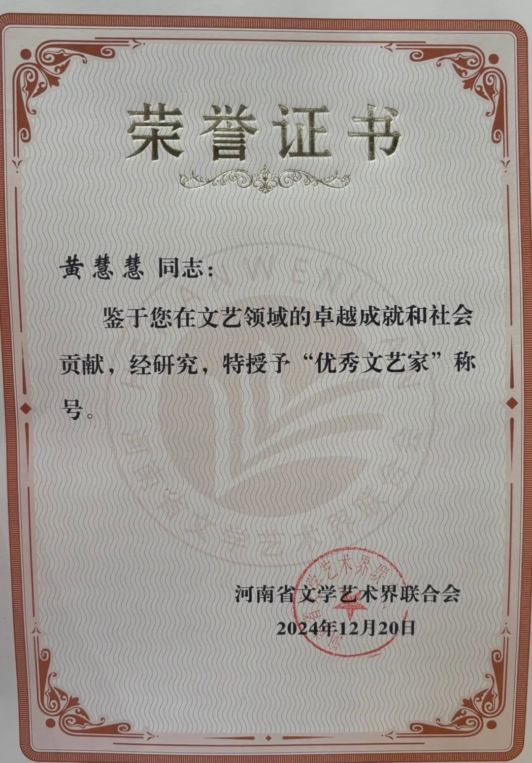声歌系主任、省音协副主席黄慧慧教授被评为“优秀文艺家”。