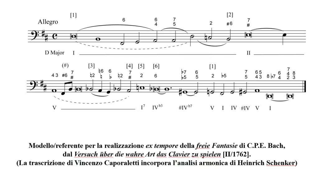 该部分,Caporaletti教授主要介绍了十八世纪以来意大利那波勒斯地区发展起来的声部即兴法(Partimento)。他以巴赫的儿子卡尔·菲利普·巴赫(Carl Philipp Emanuel Bach)在1762年创作的旋律为例,揭示如何根据低音进行即兴演奏。由此指出与民间音乐“模板”存于记忆中不同的是,18世纪西方古典音乐中的“模板”是文本形式,但二者功能是相似。