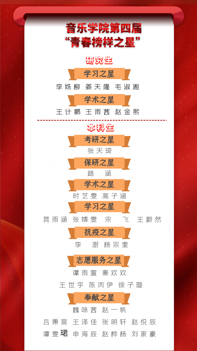 学生各类先进典型,并进行宣传表彰,充分发挥榜样的示范引领作用,旨在营造引导大学生健康成长的良好环境。希望大家跟随榜样的脚步,再接再厉,共同努力,创造更美好的未来,让我们与音院共同前行!