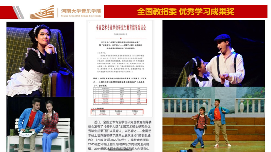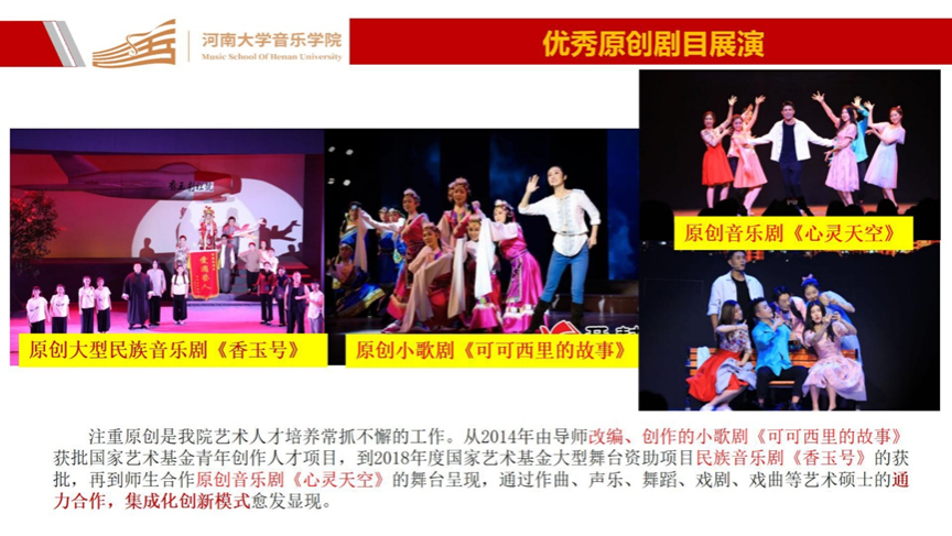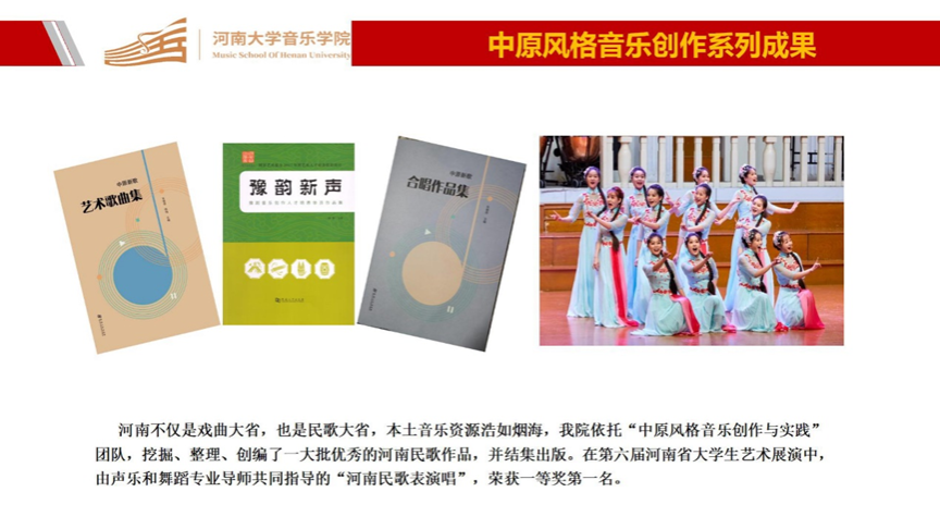 在学科建设、人才培养上特色鲜明,定位准确,遵循新文科教育宗旨,依托教育部重点研究基地黄河文明与可持续发展研究中心、国家级中华优秀文化艺术(豫剧)传承与保护基地,依托中国传统音乐研究所、宋代音乐研究所、河南地方戏研究所等校级研究机构,近年来在宋代音乐、丝路传统音乐、当代流行音乐、豫剧源流发展、中外经典歌剧实践研究等研究领域成果丰硕。