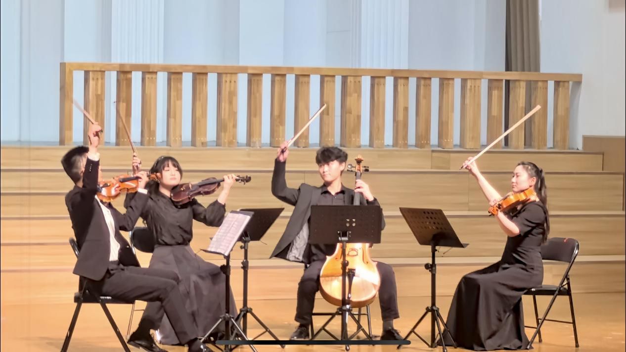 音乐会尾声以德沃夏克《F大调第十二弦乐四重奏》第四乐章拉开序幕,这段充满着激情与力量的旋律,不仅展现了热烈的欢乐情绪,更巧妙地融入了深沉的情感表达,将欢乐与激情推向顶点。紧接着,铜管十重奏《钢铁洪流进行曲》以磅礴的气势奏响,雄浑的音色与铿锵的节奏交织,仿佛展现人民军队无坚不摧的豪迈气概。随后,铜管乐《我的中国心》深情演绎,嘹亮而温暖的音色将赤子情怀抒发得淋漓尽致。