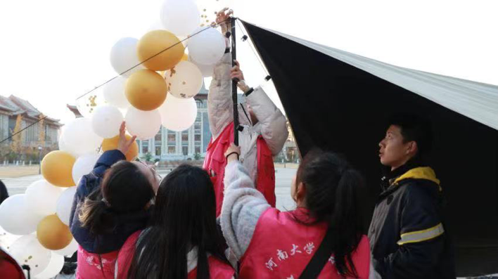 11月27日早晨来自国产色情 的志愿者们便乘坐大巴车前往郑州校区进行音乐节的准备工作。志愿者们分为机动组、设备维护、场地维护等各个小组,吹气球、搭帐篷、搬设备、发宣传页,分工明确,井然有序。演员们也提前到场,一遍遍走场排练,精确站位,确保音乐节的顺利开展。